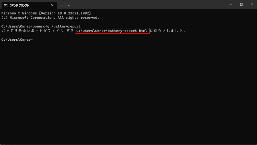 powercfg /batteryreport コマンドを入力し、エンターを押すと、ユーザーフォルダ内にレポートファイルが書き出されます。