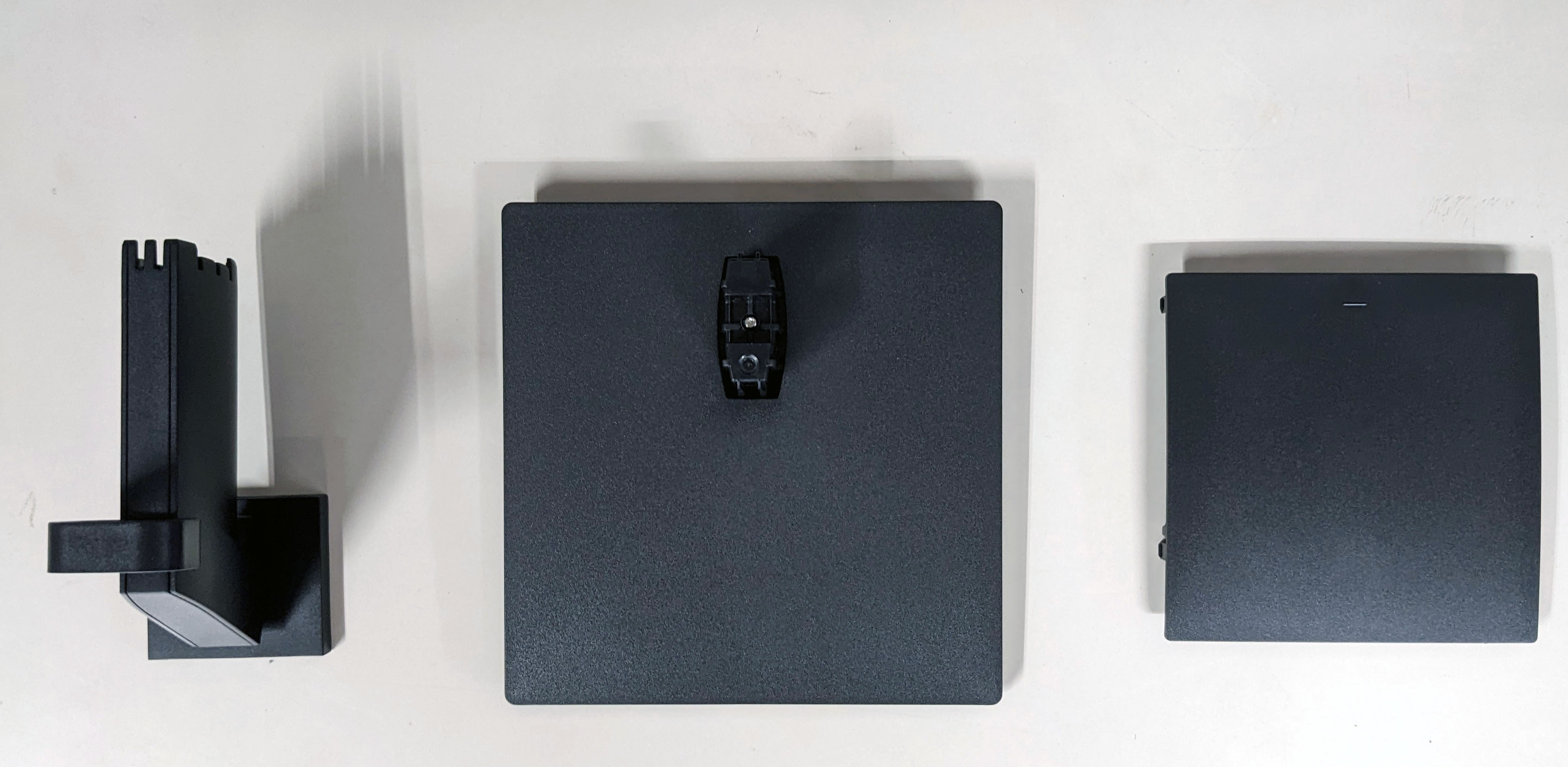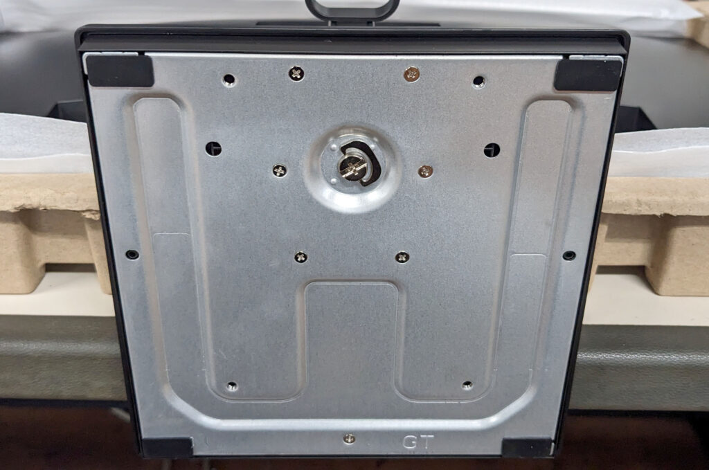 組み立ては、スタンドの部品をそれぞれはめ込み、ネジを締めるだけで完了します。工具を使わずに簡単に組み立てられ、組み立て時間は約2、3分もあれば完了します。最後にVESAマウントカバーを取り付ければ完成です。
