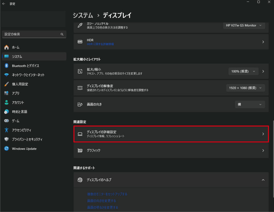 2.「システム」内の「ディスプレイ」を選び、「ディスプレイの詳細設定」を開きます。