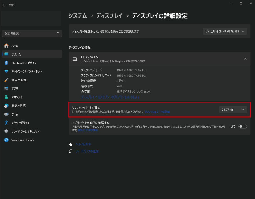 リフレッシュレートを75Hzに変更しても、体感では分からないレベルの変化しかないので、動作の安定性を重視する場合は60Hzのままでも良いと思います。