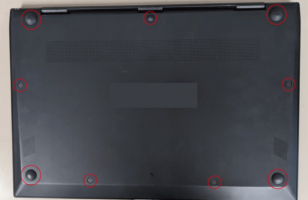 1.まずはPC裏側(下画像赤丸部分)のゴム足を外して、隠れているネジをすべて取り外します。