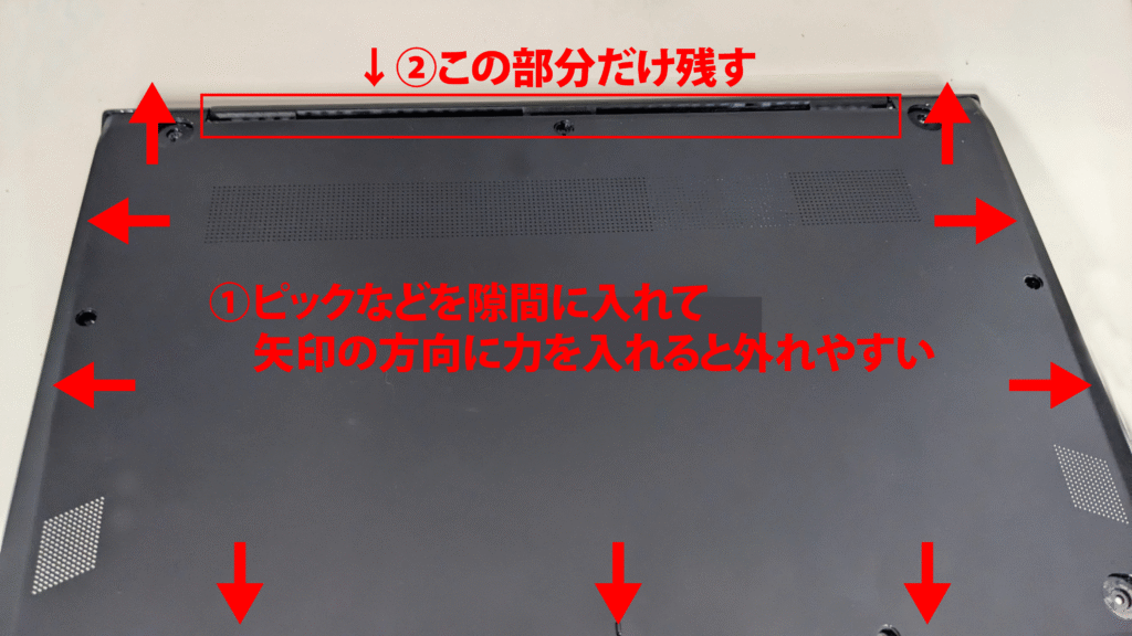 フタを開ける際の最初の突破口は手前側(タッチパッド側)の右下角、または左下角からピックなどを挿し込み開けていきます。