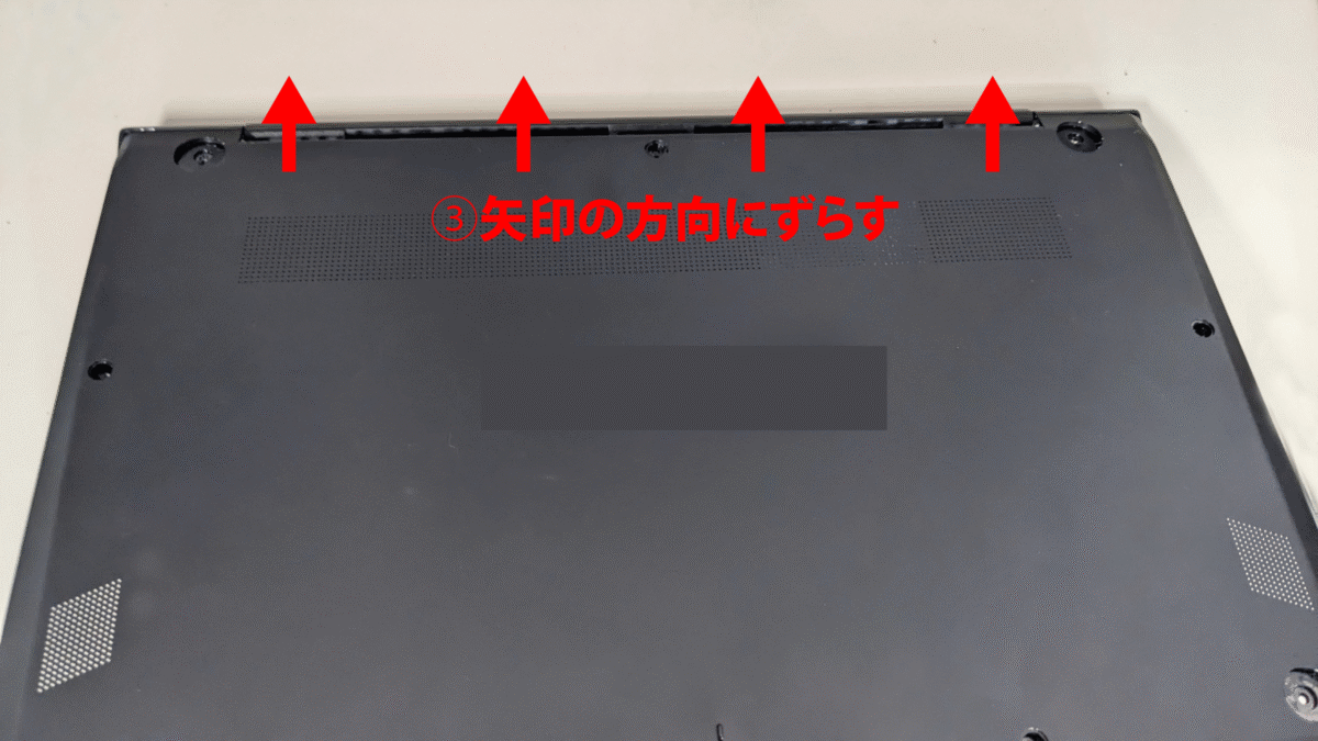 ③左右下3方向のツメが外れた状態で矢印の方向にずらせば裏蓋が外れます。