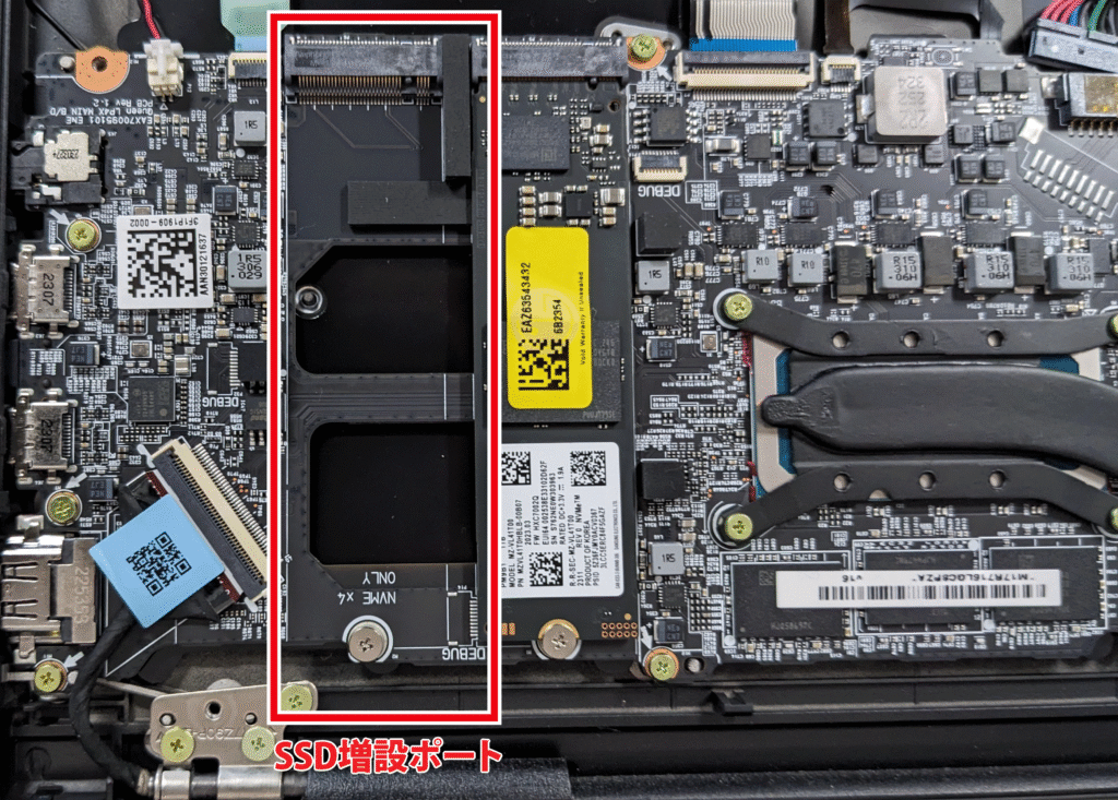 裏蓋を開けると、SSD増設ポートにアクセスできるようになります。