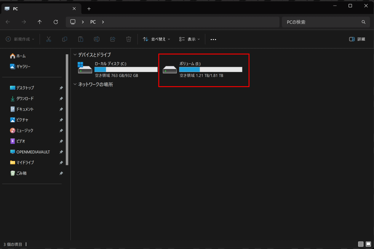 ボリューム(E:)に2TBのSSDが増設できたことが確認できました。もう一度言いますが、すでに中にデータが入っているのは、外付けケースに入れて使っていたSSDを流用したためです。中にデータが入った状態で移植しても問題なく使用できました。