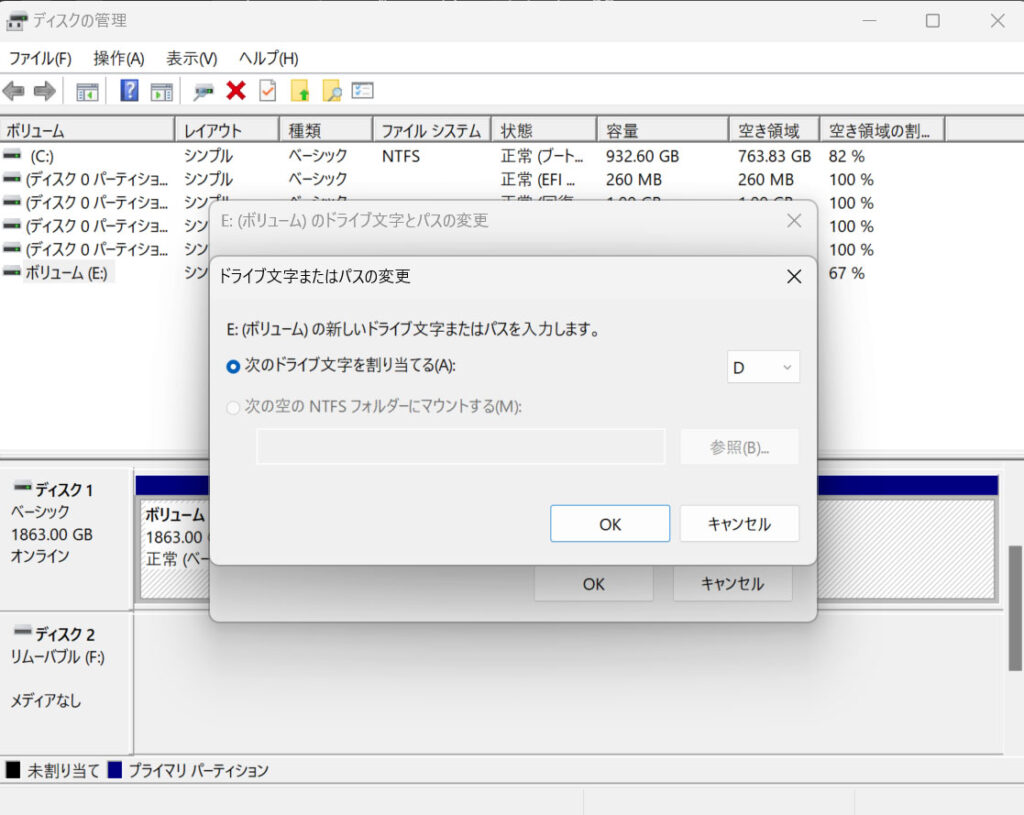 スタートボタンを右クリックして「ディスクの管理」を開き、Eドライブの上で右クリックして「ドライブ文字またはパスの変更」を選び、Dドライブに名前を変更しました。