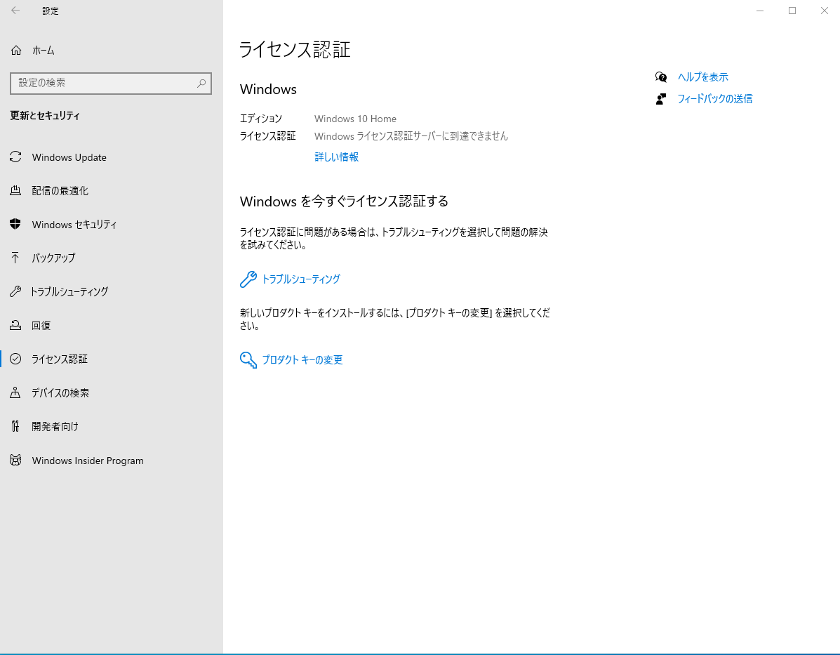 この時点では、まだネットに繋がっていないので、「Windows ライセンス認証サーバーに到達できません」と表示されています。この後に、ネットに繋ぐと、自動でライセンス認証の可否判定が下されます。