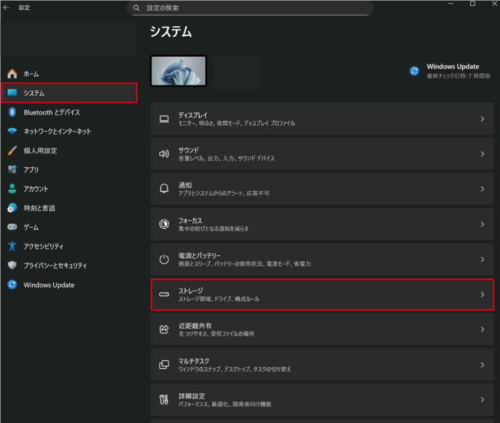 2.左メニューの「システム」から、「ストレージ」を選択します。