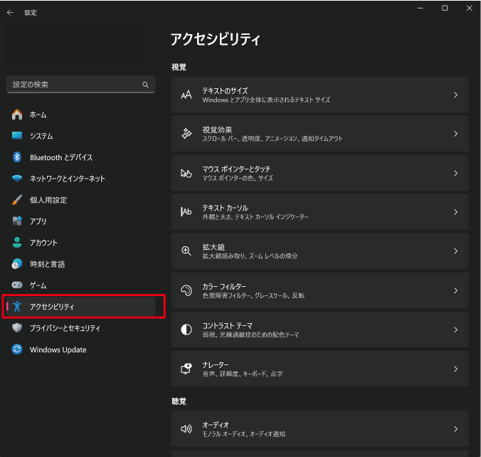 1.スタートボタンから「設定」を開き、左メニューの「アクセシビリティ」を選びます。