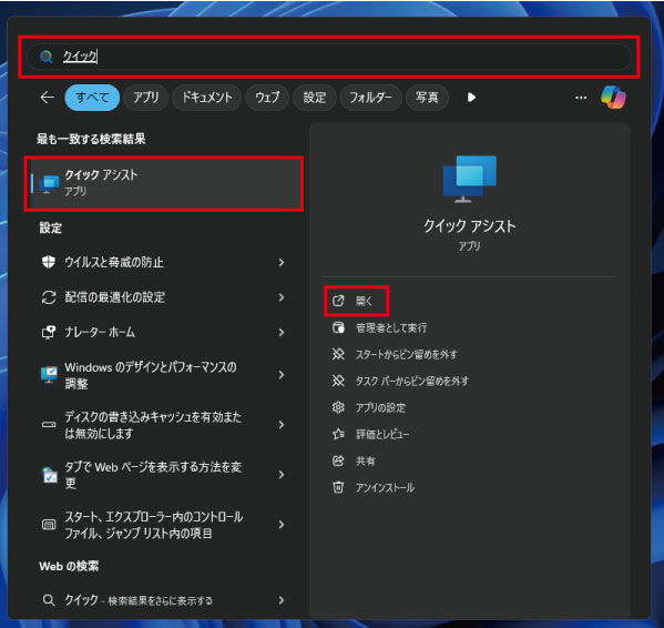 見つからない場合は、スタートボタン横の「検索」「クイック」と入力し、検索結果から「クイックアシスト」を開いてください。他にも「クイックアシスト」「アシスト」「q」などのキーワードで検索すると見つかります。