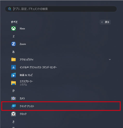「スタートボタン」から「すべてのアプリ」に入り、「クイックアシスト」を選択します。