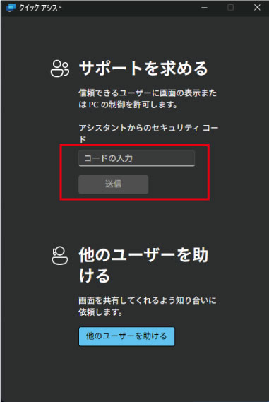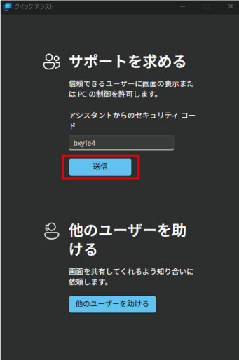 「コードの入力」の欄に「6桁のコード」を入力して「送信ボタン」をクリックします。「6桁のコード」は、接続元(サポートをする側)からメールや電話などで教えてもらいましょう。