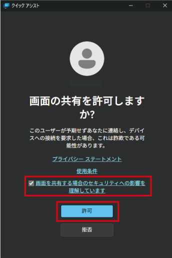 「画面の共有を許可しますか?」と聞かれるので、「画面を共有する場合のセキュリティへの影響を理解しています。」にチェックマークを付けて「許可」を選択します。