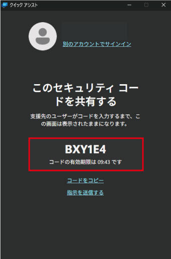 接続元の画面には、サポート用の6桁のコードが表示されています。