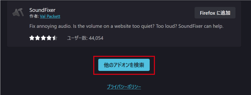 2.「拡張機能の管理」画面が開くので、ページの最下部「他のアドオンを検索」を選択します。ちなみに「FireFox アドオン」で検索しても同じページに行くことができます。
